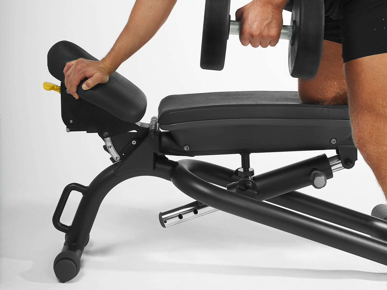 Această bancă multifuncțională are un design simplu și compact, creat special pentru antrenamente cu haltere și gantere. Este ușor de depozitat și mutat, chiar și acasă, datorită roților integrate și mânerului.
